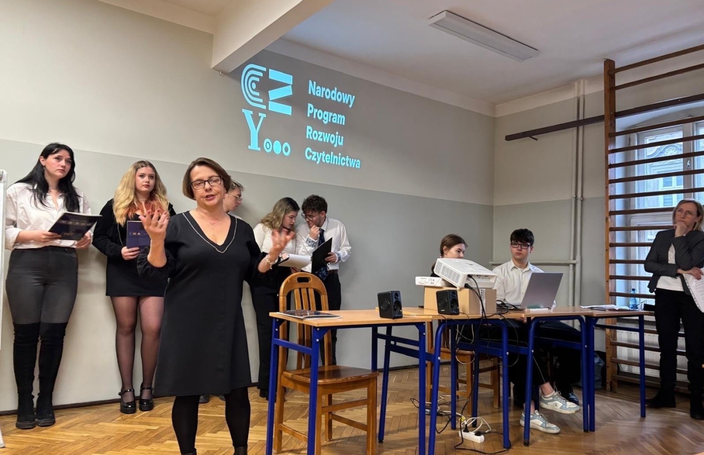 Konferencję rozpoczęła bibliotekarz szkolny, pani Iwona Szymik, która jest koordynatorem działań związanych z Narodowym Programem Rozwoju Czytelnictwa. Pani Szymik krótko opowiedziała o programie i zaprosiła wszystkich uczestników konferencji do wypożyczania nowych książek z biblioteki szkolnej.